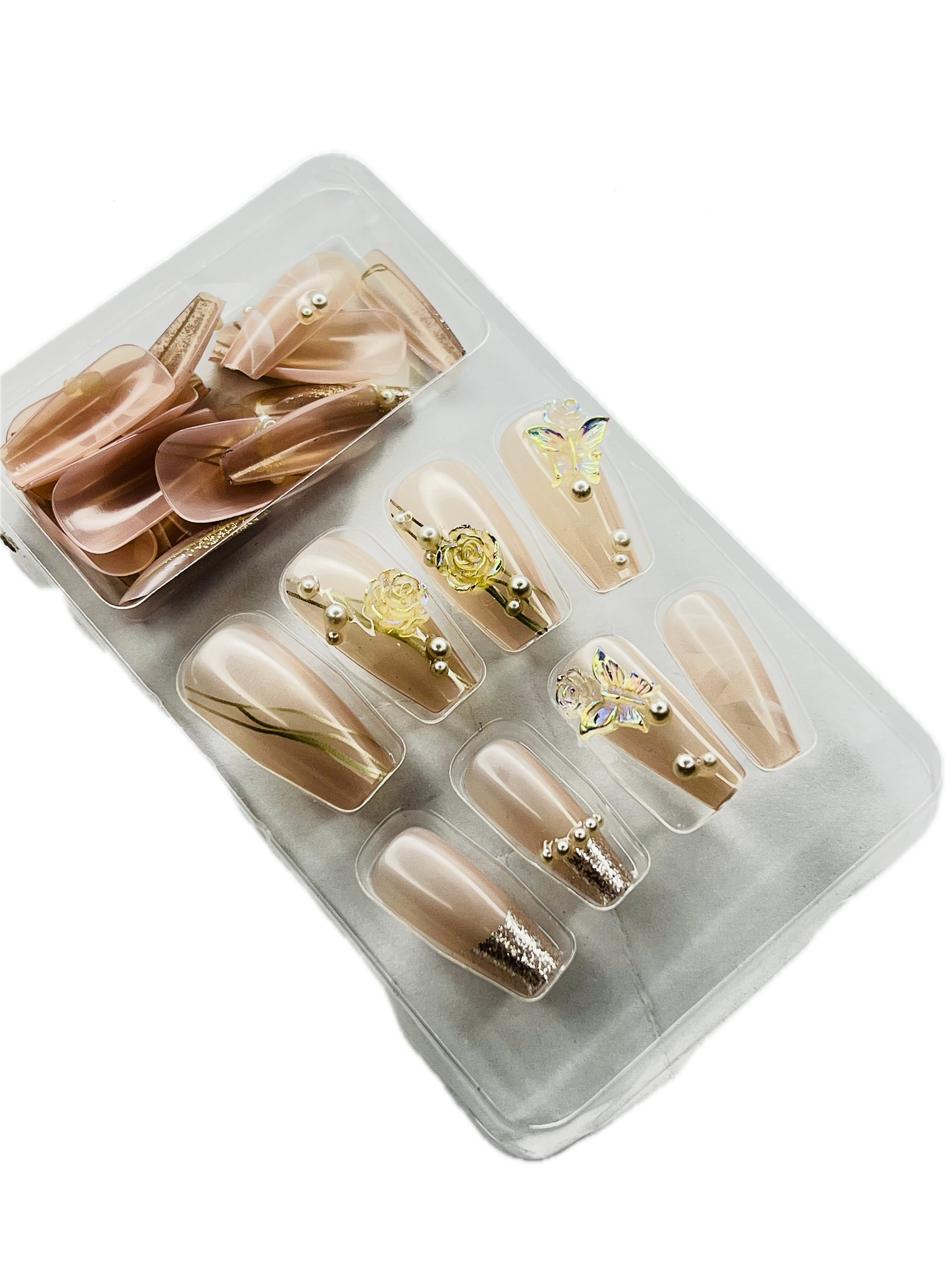 Add a touch of graceful charm to your fingertips with ENCHANTED ROSE & BUTTERFLY 🌹🦋✨ – a stunning press-on nail set featuring a soft pink base, glimmering gold accents ✨, and sparkling rhinestones 💎. Designed with a classic square shape for a clean and polished look.